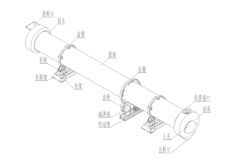 d.封頭、封尾、風管、火管:該部分構成了烘干機工作中所需的熱風循環(huán)、除塵系統(tǒng)。封頭、封尾與機體接合處之間密封性良好,從而使熱風不斷地帶走顆粒中所含的水分,達到均勻烘干顆粒的目的。操作人員需要進入筒體內(nèi)部進行作業(yè)時,請在停機情況下由檢修孔進入。